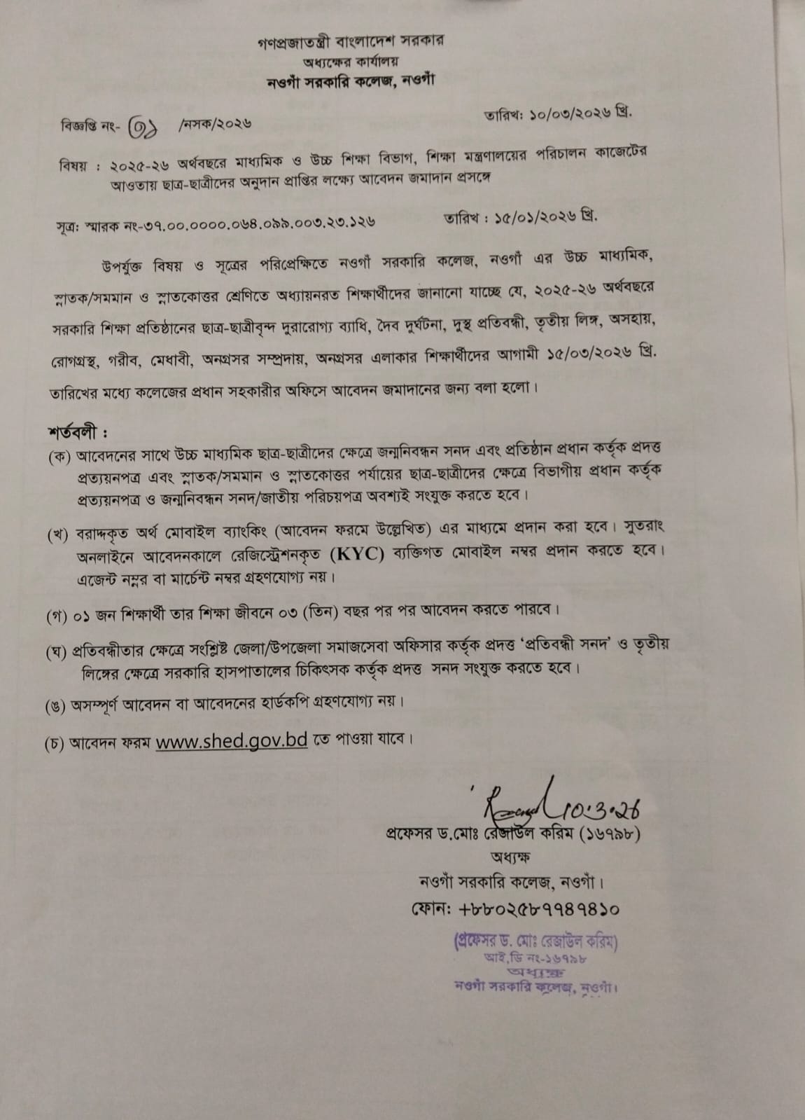 ২০২৫-২০২৬ অর্থবছরে মাধ্যমিক ও উচ্চ শিক্ষা বিভাগ, শিক্ষা মন্ত্রণালয়ের পরিচালনা বাজেটের ছাত্র-ছাত্রীদের অনুদান প্রাপ্তির লক্ষ্যে আবেদন জমাদান সংক্রান্ত।